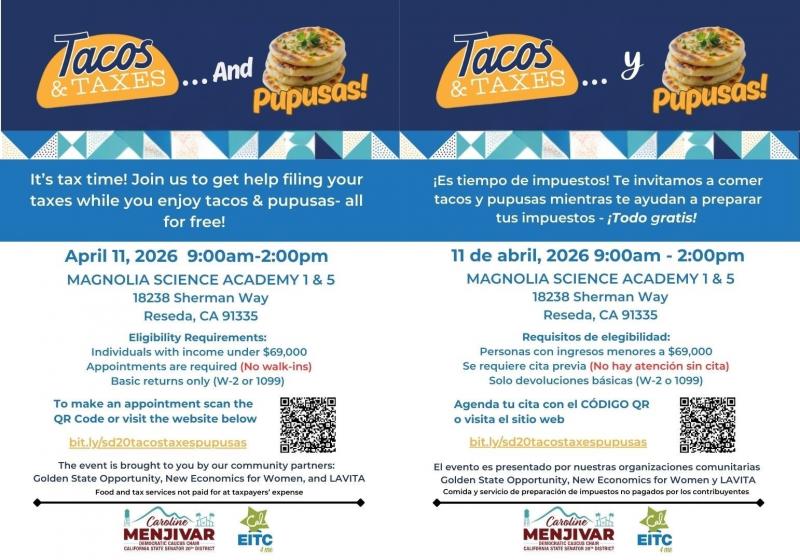 Tax season doesn’t have to be stressful, especially with my Tacos and Taxes & PUPUSAS coming soon, April 11th! I’m thrilled to partner once again with Golden State Opportunity, New Economics for Women, and Magnolia Science Academy in Reseda to bring IRS-certified tax preparers directly to my constituents. Find out if you qualify for additional state tax credits while enjoying delicious pupusas, for free! My District staff will also be on-site to share how we can assist you with state services. Secure your appointment below or call my office at (818)901-5588.